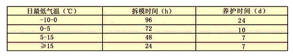 四、冬季施工时,养护措施还应符合现行《钢筋混疑土工程施工及验收规范》(G850204)的有关规定。温度、养护与拆膜日寸间表如下: